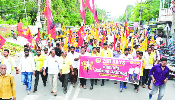 ప్రజాశక్తి-బాపట్ల: నారా లోకేష్ యువగళం పాదయాత్రకు సంఘీభావంగా బాపట్లలో అపూర్వ స్పందన లభించింది. గురువారం బాపట్ల తెలుగుదేశం పార్టీ ఇన్చార్జి వేగేశన నరేంద్రవర్మ ఆధ్వర్యంలో నారా లోకేష్ చేపట్టిన యువగళం పాదయాత్ర 200 రోజులు పూర్తి చేసుకున్న సందర్భంగా బాపట్లలో భారీ ర్యాలీ నిర్వహించారు. బాపట్ల తెలుగుదేశం పార్టీ కార్యాలయం నుంచి పార్టీ కార్యకర్తలతో ప్రారంభమైన భారీ ర్యాలీ పురవీధుల్లో కొనసాగింది. ఈ సందర్భంగా నరేంద్రవర్మ మాట్లాడుతూ రాష్ట్రంలో అరాచక పాలన అంతమొందించడమే లక్ష్యంగా జన ప్రభంజనంతో సాగుతున్న నారా లోకేష్ చేపట్టిన యువగళం పాదయాత్ర దిగ్విజయంగా 200 రోజులు పూర్తి చేసుకున్న సందర్భంగా బాపట్ల నియోజకవర్గ తెలుగుదేశం పార్టీ తరపున శుభాకాంక్షలు తెలిపారు. యువగళం పాదయాత్రకు ప్రజల నుంచి వస్తున్న అపూర్వ స్పందన చూసి వైసీపీ నాయకులకు వెన్నులో వణుకు మొదలైందన్నారు. లోకేష్ గారు అడుగుపెట్టిన ప్రతి నియోజకవర్గంలో ప్రజలు భారీ సంఖ్యలో స్వచ్చందంగా తరలివచ్చి లోకేశ్ మద్దతు పలకడం పట్ల ప్రభుత్వంపై ప్రజలకు ఎంత వ్యతిరేకత ఉందో అర్థం అవుతోందన్నారు. మహిళలు మంగళహారతులు పడుతూ స్వాగతం పలకడం పార్టీ మీద వారి ప్రేమాభిమానాలకు నిదర్శనమన్నారు.