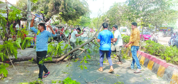 ప్రజాశక్తి- సీతమ్మధార : శంకరమఠం రోడ్లో బుధవారం మధ్యాహ్నం ఒంటి గంటన్నర సమయంలో రోడ్డు పక్కనున్న చెట్టు కొమ్మ హఠాత్తుగా కూలిపోయింది. నిత్యం రద్దీగా ఉండే మార్గమైనప్పటికీ, మధ్యాహ్న సమయంలో రోడ్డుకు అడ్డంగా భారీ కొమ్మ కూలినప్పటికీ ఎవరికి ఎటువంటి ప్రమాదం, నష్టం వాటిల్లలేదు. అయితే వాహనాలు, పాదచారుల రాకపోకలకు వీలులేనట్లుగా రోడ్డుకు అడ్డంగా చెట్టు కొమ్మ పడడంతో ట్రాఫిక్కు అంతరాయం ఏర్పడింది. సమయానికి ట్రాఫిక్ పోలీసులు కూడా లేకపోవడంతో స్థానిక యువత కొంతమంది ముందుకొచ్చి రోడ్డుపై పడిన చెట్టు కొమ్మలను తొలగించారు. వాహన రాకపోకలకు మార్గం సుగమం చేశారు. యువత చొరవను పలువురు పాదచారులు, వాహనదారులు అభినందించారు.